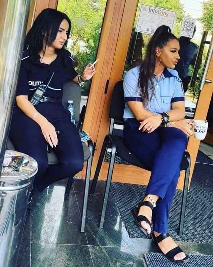 În fotografia devenită virală apar două polițiste care stau pe scaun, în timp ce fumează și beau cafea.